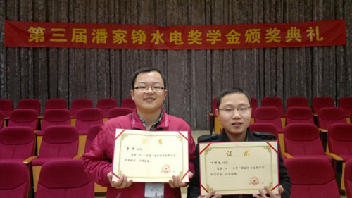 潘家铮水电奖学金是以我国著名水电水利专家、中国科学院和中国工程院两院院士潘家铮先生名字命名的奖学金,由中国水力发电工程学会和中国水电工程顾问集团公司联合发起,全国水电水利系统42家企事业单位参与,旨在弘扬潘家铮院士“忠诚敬业,求实创新”的精神,勉励热爱祖国水电水利事业、品学兼优、勇于创新的本科生和研究生积极投身我国的水电水利建设事业。获得第三届潘家铮水电奖学金的人员有来自清华大学、武汉大学、河海大学、华北水利水电学院、南京水利科学研究院、中国水利水电科学研究院和国网电力科学研究院等13家水电水利类专业院校(或设有水电水利类专业的院校)的26名本科生和18名研究生。我院曹伟、叶祥飞两位同学喜获该项奖励,并登台领奖。展现了我院研究生的风采。