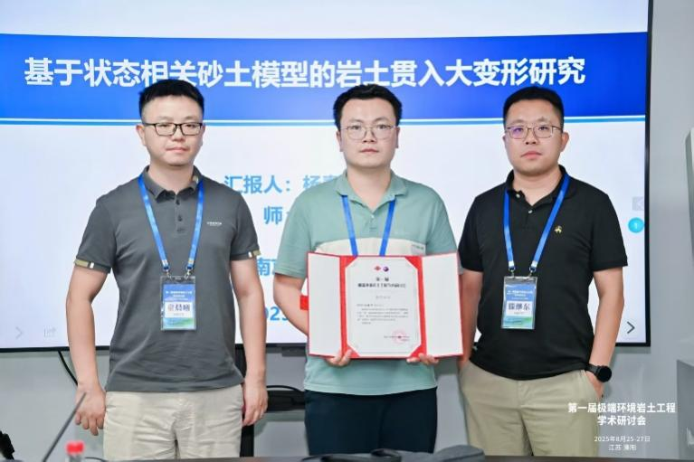 2025年8月25-27日,第一届极端环境岩土工程学术讨论会在江苏常州举行,水利部 交通运输部 国家能源局南京水利科学研究院2022级博士研究生潘超钒(指导教师:蔡正银正高、张晨正高)、杨春节(指导教师:蔡正银正高)及2023级博士研究生李云铧(指导教师:蔡正银正高)参加本次论坛并做学术报告。