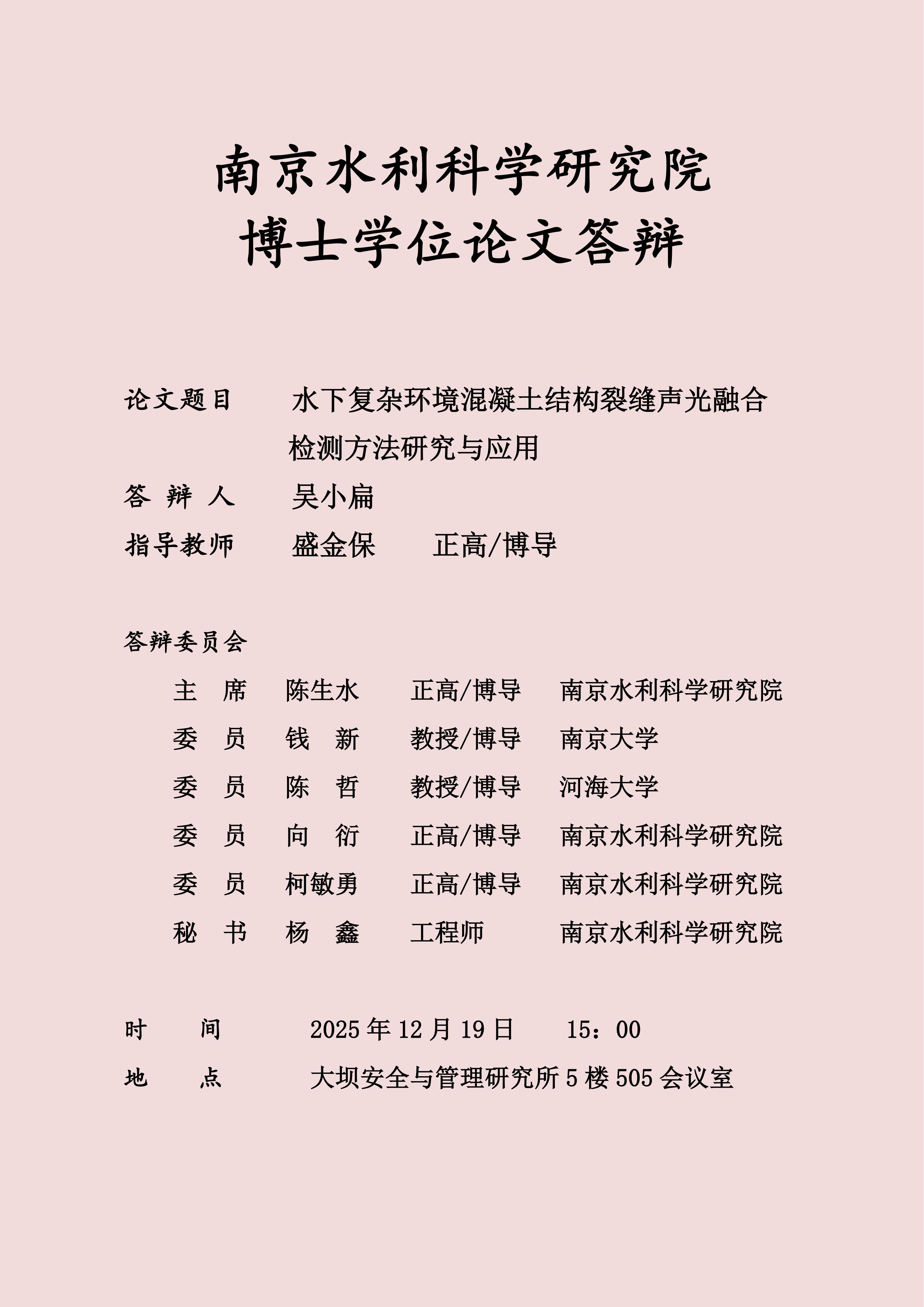 吴小扁博士研究生学位论文答辩:水下复杂环境混凝土结构裂缝声光融合检测方法研究与应用