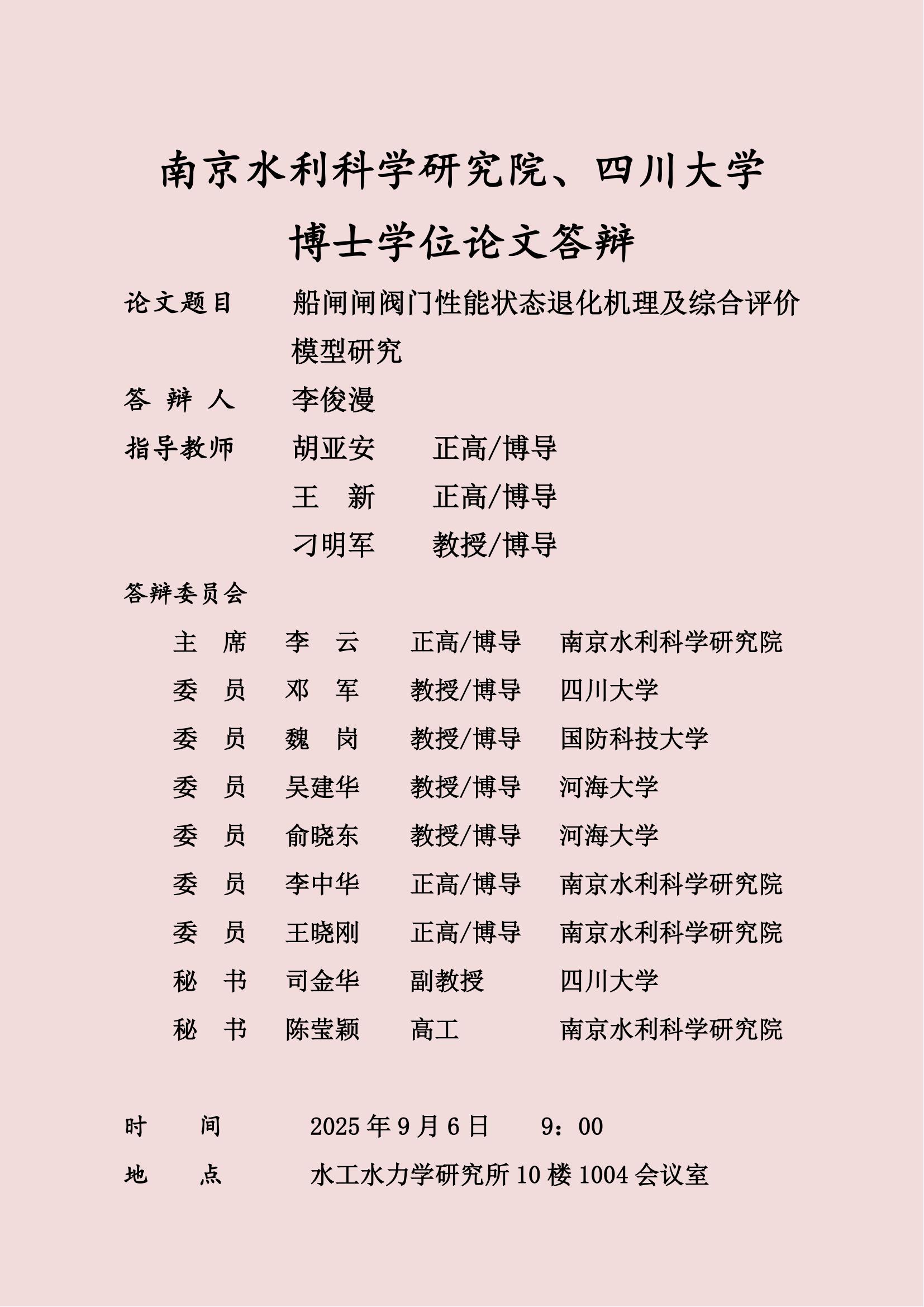 李俊漫博士研究生学位论文答辩:船闸闸阀门性能状态退化机理及综合评价模型研究