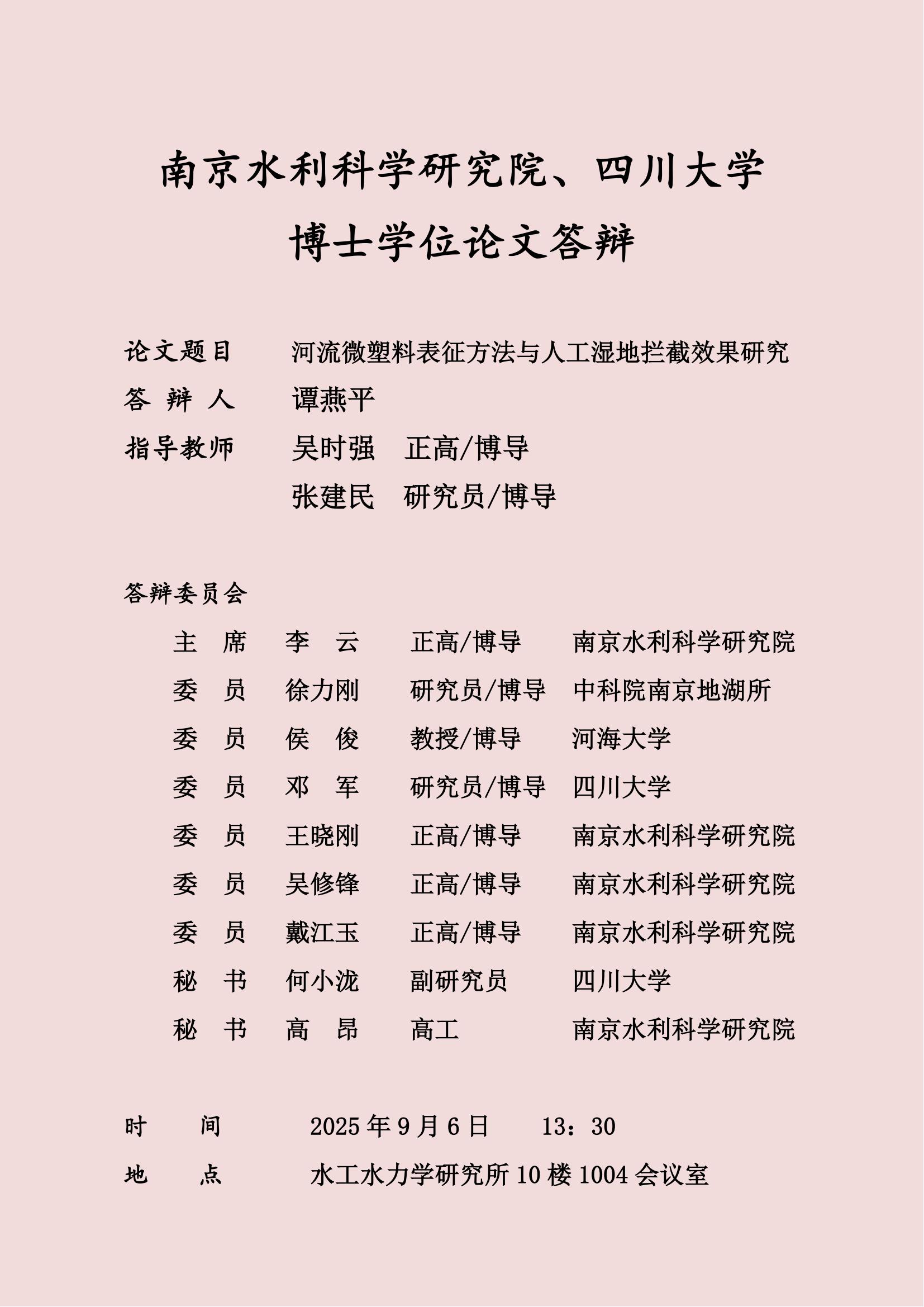 谭燕平博士研究生学位论文答辩:河流微塑料表征方法与人工湿地拦截效果研究