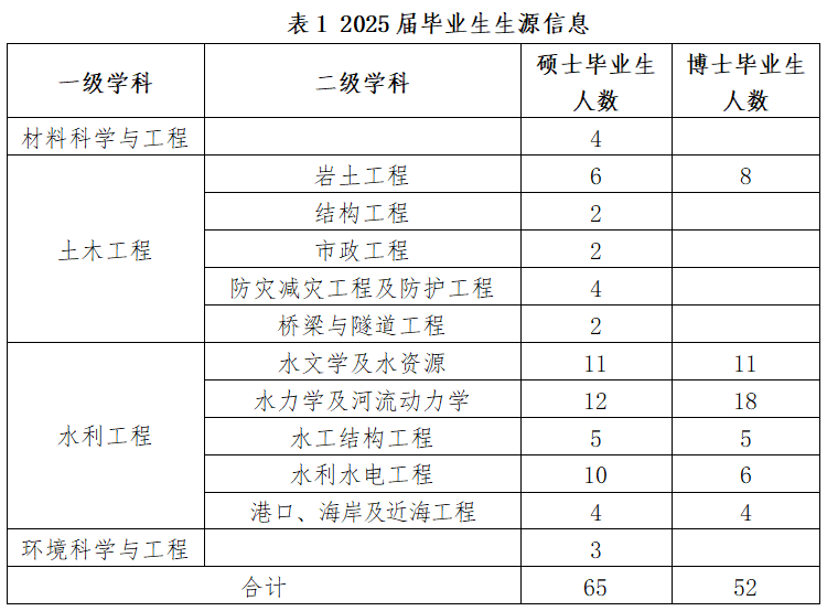 南京水科院2025届毕业研究生规模预计达117人,其中硕士生65人,博士生52人。2025届毕业生不同层次、专业研究生分布情况详见下表。
